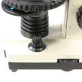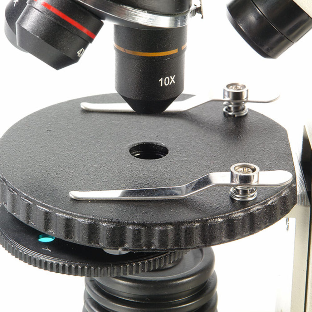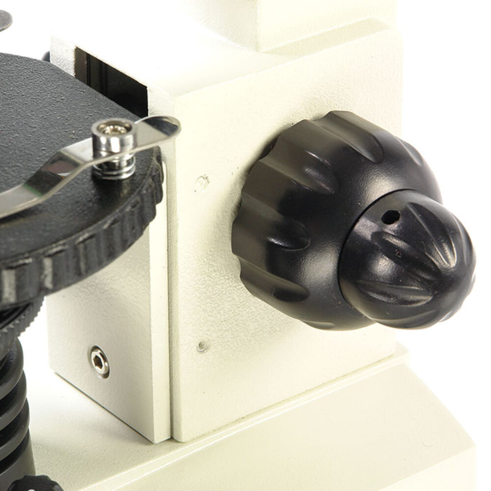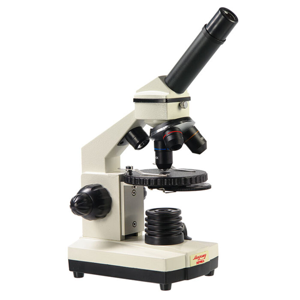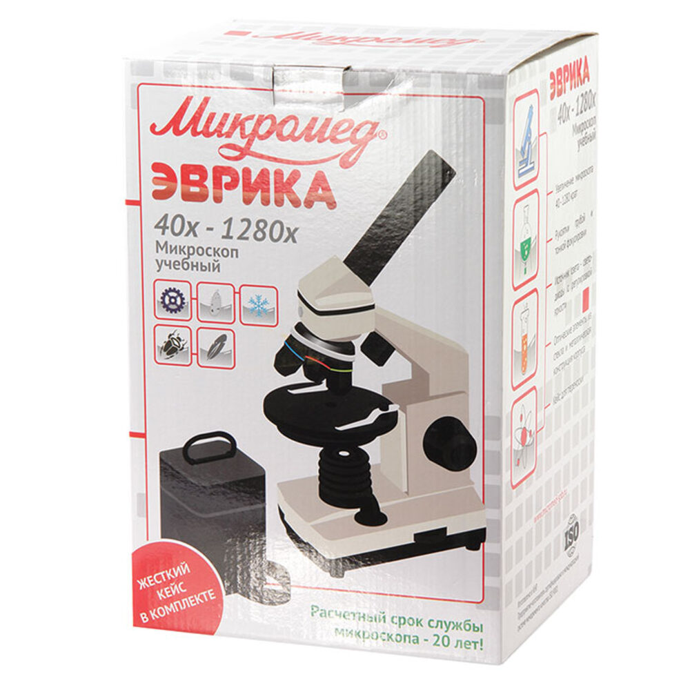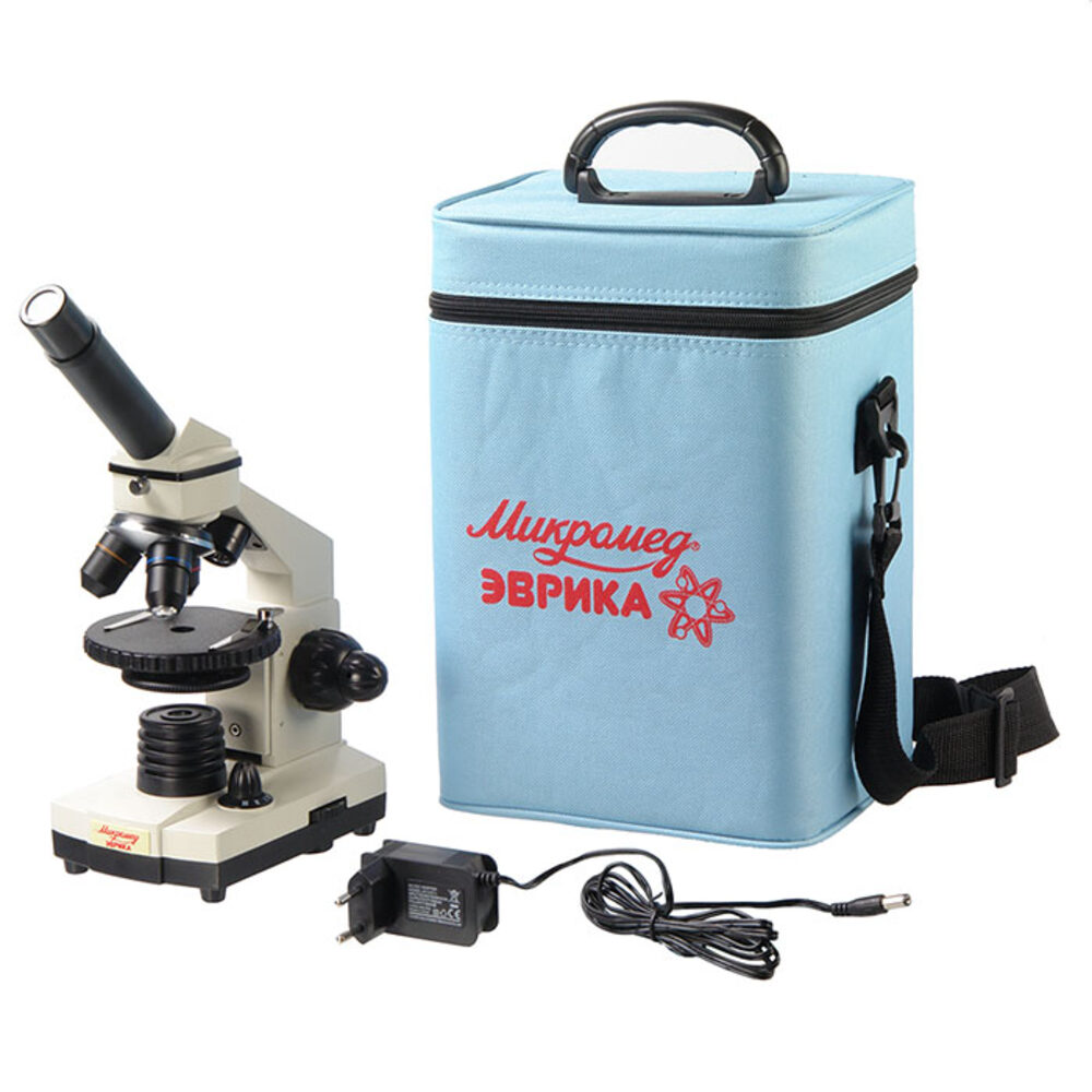 Оптические элементы из стекла и металлическая конструкция обеспечивают хорошее качество изображения и длительный срок эксплуатации микроскопа. Светодиодные осветители позволяют быстро настроить освещение. Осветители имеет плавную регулировку яркости при работе с объективами большого увеличения требуется более высокая яркость для получения хорошего качества изображения, а при работе с объективом малого увеличения требуется уменьшить освещенность объекта. Осветитель отраженного света позволяет исследовать на малых увеличениях объективов непрозрачные плоские объекты. Осветители работают от сети 220В (через адаптер, который входит в комплект) и от батареек типа АА (в комплект не входят), что дает возможность использовать микроскоп и дома, и в учебном классе, и в полевых условиях. Механизм ограничителя (упора) и пружинящая оправа у объектива увеличением 40 крат обеспечивают предохранение от механического повреждения фронтальной линзы объектива и объекта. Клеммы с пружинным механизмом позволяют удобно расположить препарат на предметном столике. Долговечность и точность фиксирования подвижной части револьвера обеспечено применением специальной смазки стальных элементов. Сохранив в себе все достоинства микроскопа Эврика, который поставляется в кейсе с видеоокуляром и микролабораторией, дорожный вариант этого учебного микроскопа поставляется в текстильном кейсе, удобном для длительного ношения и обеспечивающем сохранность оптического прибора. Кейс имеет различные «кармашки» и «держатели» для препаратов, пинцетов, стекол, и других приспособлений, которые понадобятся в походных условиях, и которые юный исследователь подберет себе сам. Удобный подвижный круглый столик обеспечивает комфортное перемещение исследуемого препарата. Рукоятки грубой и тонкой фокусировки, расположенные по обеим сторонам штатива, обеспечивают точную настройку резкости изображения на большом увеличении. Рукоятки расположены на одной оси. Такая комфортная система фокусировки отличает этот микроскоп от других школьных моделей.