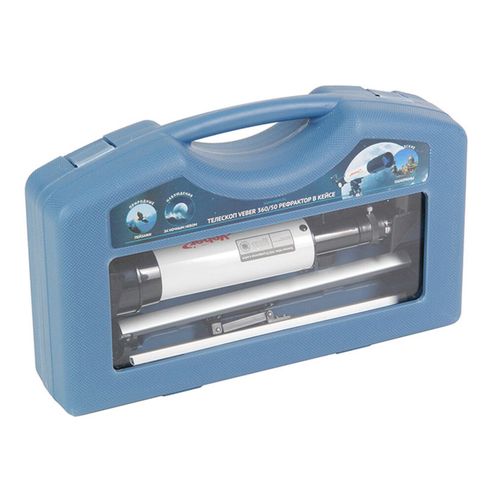 Отличный подарок для вашего ребенка! Возможно, он станет первым научным прибором в его жизни. Его можно использовать и днем и ночью. Днем — как обычную подзорную трубу, а ночью, естественно, по прямому назначению. Телескоп дает прямое (не перевернутое) изображение. Что можно в него увидеть? В него можно увидеть лунные кратеры диаметром больше 10 км, Марс, Сатурн и фазы Венеры. С помощью сменных окуляров (в комплекте 2 шт.), можно получить увеличение от 18х до 90х. Окулярная часть с 90° зеркалом позволяет удобно вести наблюдение, разместив прибор просто на столе (высота штатива 360 мм). Наблюдения днем лучше вести при увеличении 18х (с окуляром 20 мм), тогда ближняя точка фокусировки будет около 5 метров. Прибор удобно укладывается в противоударный двухслойный кейс для переноски. Сборка занимает не больше трех минут. Так с ним удобнее выезжать загород, где и небо чище и лучше видны звезды и окружающие пейзажи.